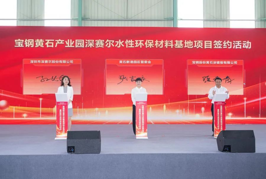 5月18日,深賽爾水性環保材料基地項目簽約暨寶鋼股份黃石涂鍍板項目全面投產活動在湖北省黃石市黃石新港園區寶鋼黃石產業園隆重舉行。公司董事長劉國民出席活動并做重要講話。